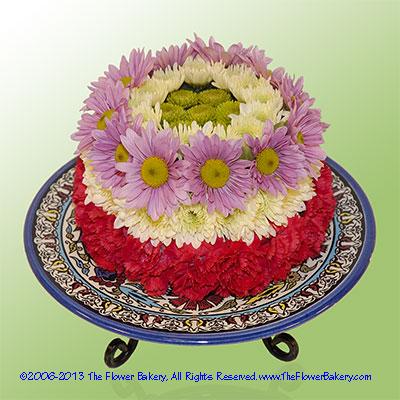 Reminiscent of the Hawaiian spirit, the Mini Aloha™ Flower Cake is the perfect way to say "hello". Red mini carnations, lavender daisies, green buttons and creamy cushions are arranged beautifully and presented atop a 8.5" (22cm) hand made ceramic plate.