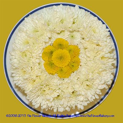 Interlocking layers of chrysanthemum cushions feather around this pretty arrangement, adorned with a golden sash. Golden Sash™ is designed with approximately 80 flowers, measures 7.5 inches in diameter and 4.5 inches tall with plate, or 7.5 inches tall with plate and riser.